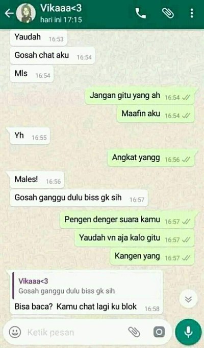 Warganet @PenjahatGunung membagikan percakapan chat tentang sepasang kekasih yang cukup menjengkelkan. Kisah ini diawali chat ngambek cewek yang minta cowoknya nggak menghubungi dulu. Dia juga mengancam memblokir jika tetap menghubungi. Padahal cowoknya cuma ingin dengar suara kekasihnya. -_-